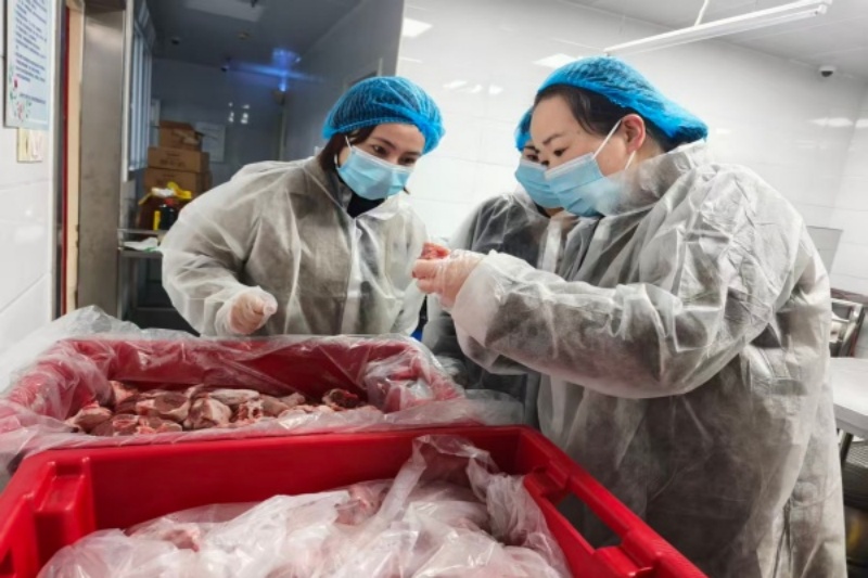 家长代表在幼儿园食品安全总监孙佳和食品安全员赵晶晶的带领下,首先来到食材验收区。新鲜的时令蔬菜、检疫合格的肉类、包装完好的米面油及调味品整齐摆放,孙佳详细介绍了食材的采购渠道——所有食材均来自具备正规资质的供应商,且索证索票齐全、可追溯。家长代表们仔细检查蔬菜的新鲜度、核验肉类的检疫证明、核对食品的生产日期与保质期,部分家长还扫描了食材包装上的溯源二维码,直观了解食材从产地到校园的全流程。“看到每一份食材都新鲜干净、来源透明,我们对孩子在园的饮食安全更放心了!”
