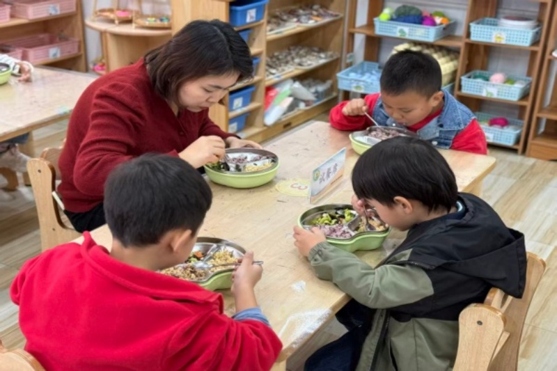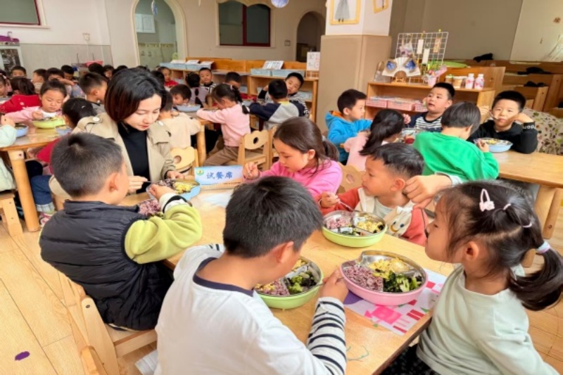 午餐时间,家长代表们来到班级,与孩子们一同围坐用餐。软糯的杂粮饭、鲜香的清炒时蔬、软烂易嚼的银鱼蒸蛋、营养丰富的排骨汤……丰富多样的餐食让孩子们吃得津津有味。家长们一边品尝,一边观察孩子们的用餐习惯,与老师交流餐食的口味调整建议。“孩子在家挑食,没想到在幼儿园吃得这么香,餐食的软烂程度也特别适合幼儿咀嚼”参与陪餐的家长忍不住点赞。