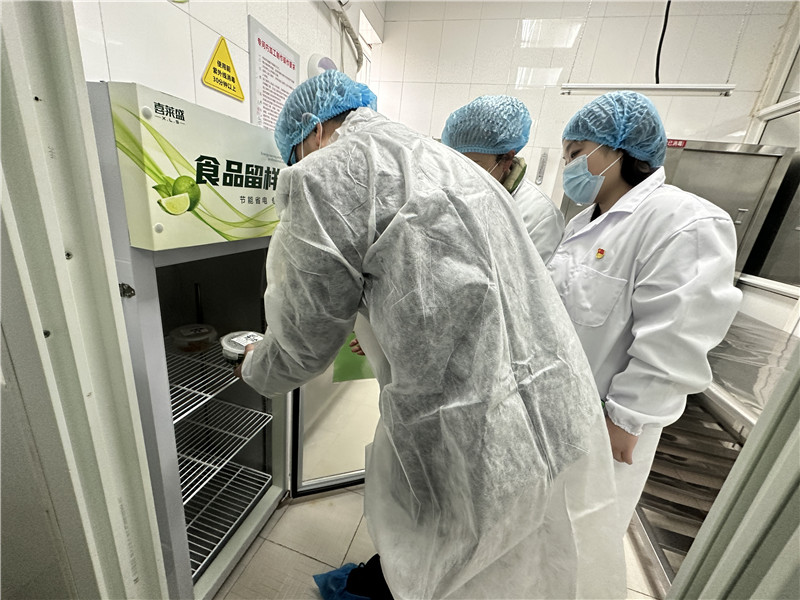 检查组深入食堂后厨、操作间、储物间等关键区域,对食堂的环境卫生、功能分区、设施设备运行状况、食材储备管理、餐饮具清洗消毒以及食品留样等重要环节进行了细致检查。重点检查了食材加工过程中是否严格执行生熟分开原则、操作流程是否规范、“三防”设施是否配备齐全且正常运行,以及从业人员现场操作是否符合相关规定,对食材采购验收、加工制作到餐食供应的全流程管理进行了严格审核。