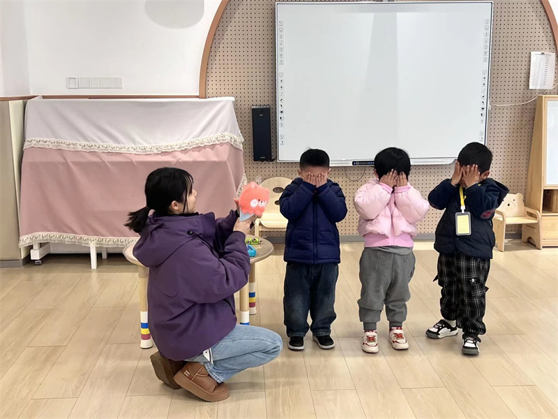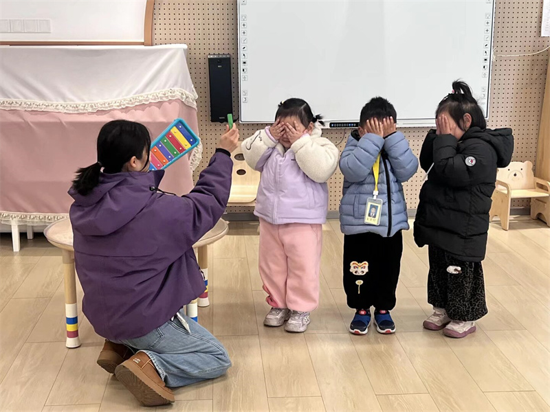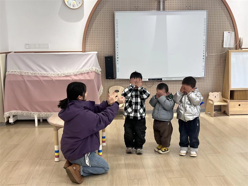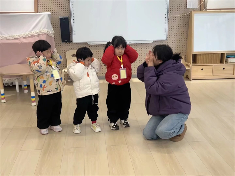活动中,教师根据托班幼儿的年龄特点,借助趣味认知、蒙眼互动游戏《猜猜我是谁》、情景模拟等方式,生动阐述耳朵的功能,并演示保护耳朵的正确方法。老师告诉小朋友们,当听到像鞭炮声、电钻声这样特别大的声音时,要赶紧捂住耳朵或者远离,保护好我们的“小耳朵”,才能一直听到世界上各种美妙的声音。小朋友们踊跃参与互动,在轻松的气氛中认识到耳朵的重要,学会辨别有害声音,形成良好的生活习惯。