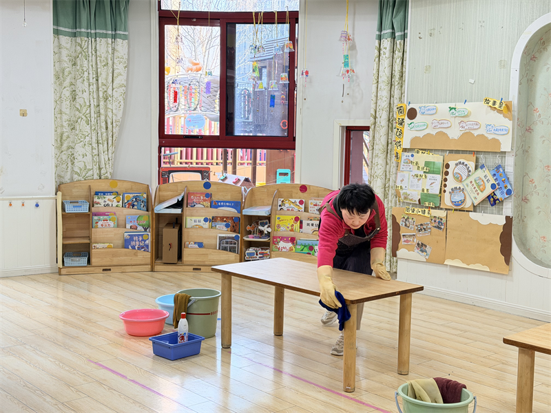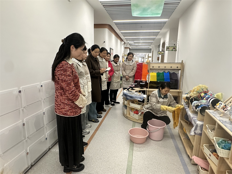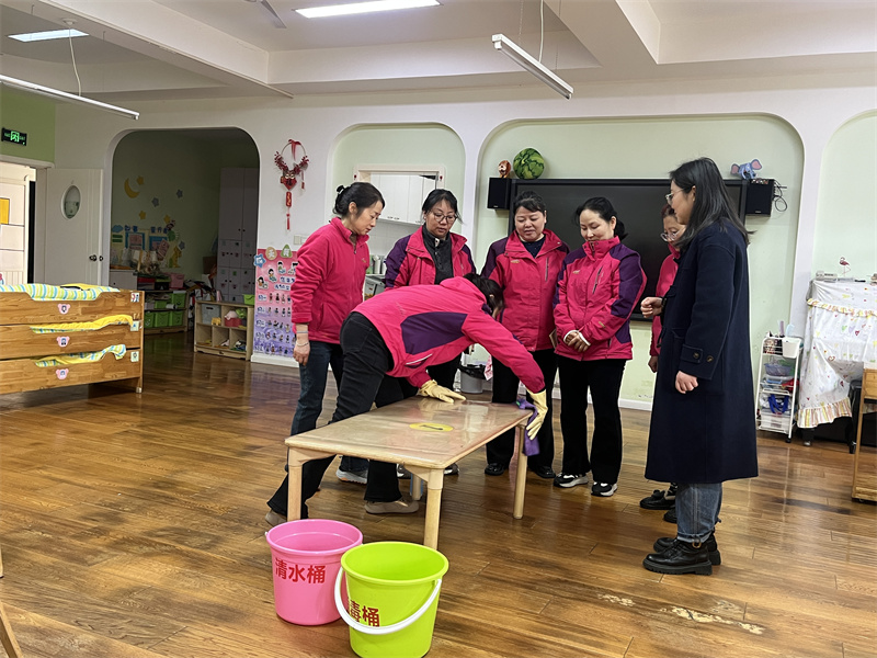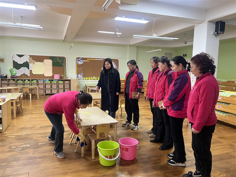 理论学习刚落下帷幕,一场别开生面的卫生消杀观摩活动便在集团各园同步开启,各园保育员先来到孩子们的桌椅、区角旁,按照“从左到右、从上到下”的顺序仔细擦拭桌面,不放过任何一个边角缝隙;随后更换专用消毒抹布,对桌沿、椅面、柜角等幼儿高频接触部位进行重点消杀,确保消毒时间充足;整个过程动作娴熟、步骤清晰。保育员们围在一旁认真观摩,记录细节。