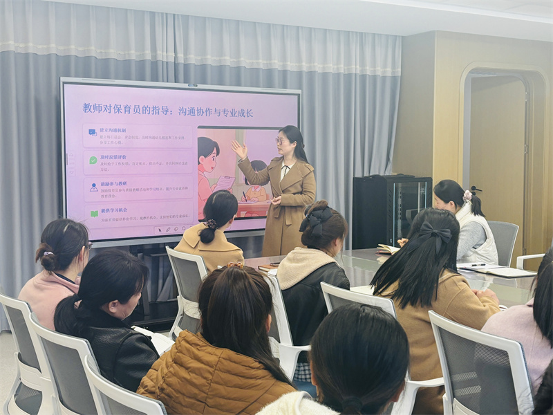 为进一步提升保育工作专业水平,规范幼儿园一日生活保育流程,强化教师与保育员的协同配合能力,2026年3月12日,合肥市大西门幼儿园固镇路分园办公室副主任范毓伟、保健老师刘魏组织全体保育员及教师开展保教联动系列培训活动。