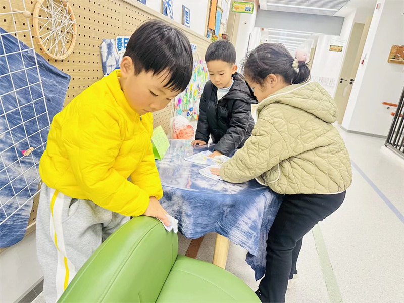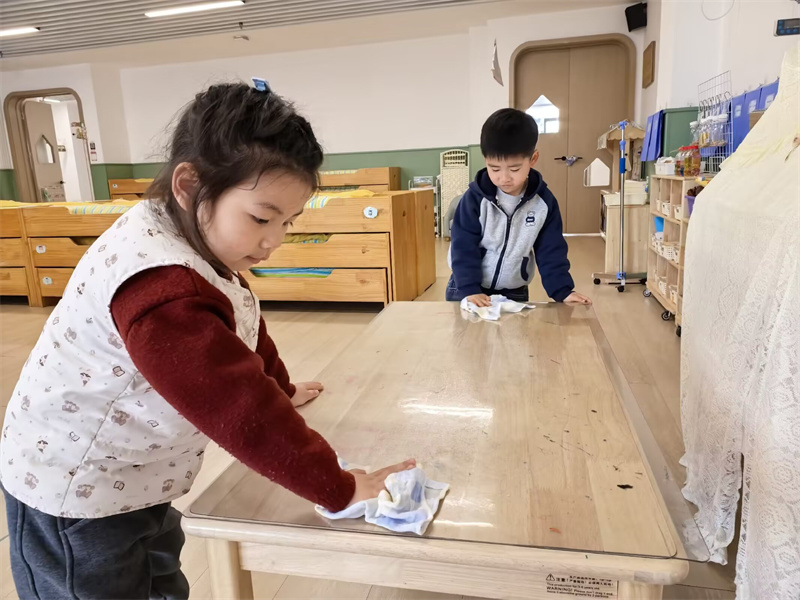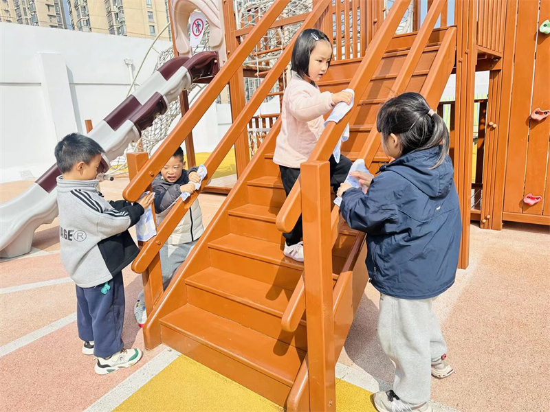 中班的孩子们积极响应爱卫与安全教育号召,化身 “卫生安全小小卫士”,为幼儿园增添洁净。孩子们在老师带领下,认真擦拭体育器械、玩具柜、扶手等高频接触物品,对幼儿园公共区域进行清洁整理,从源头减少病菌传播风险。看!小小的身影干劲十足,孩子们在劳动中感受动手的快乐,更在实践中理解卫生清洁对传染病预防的重要意义。