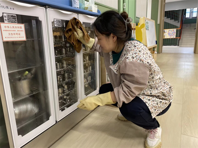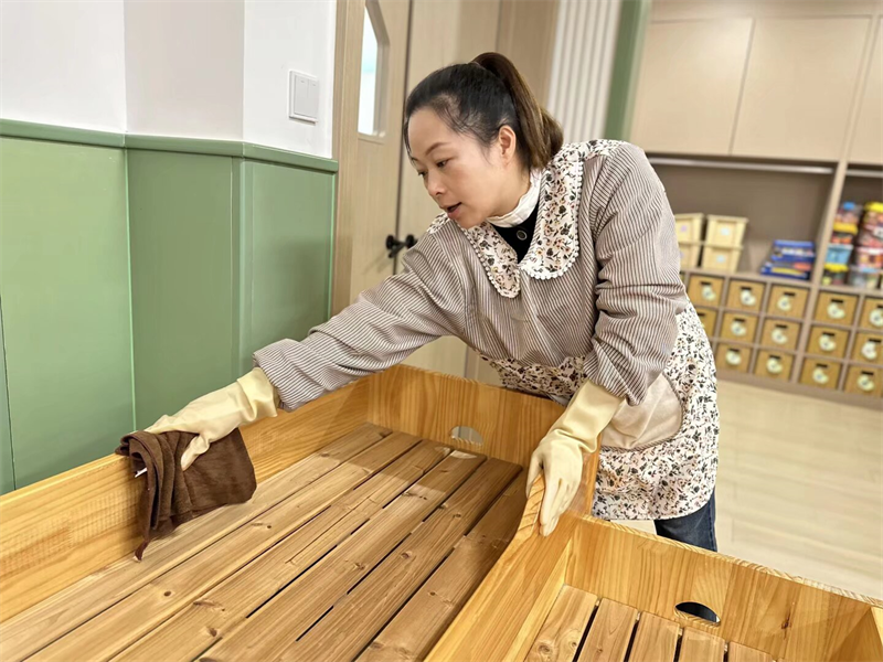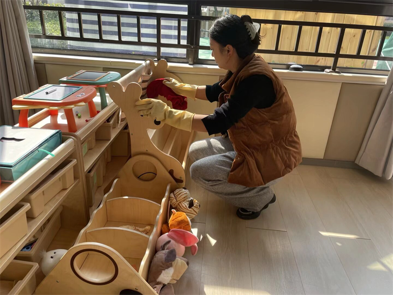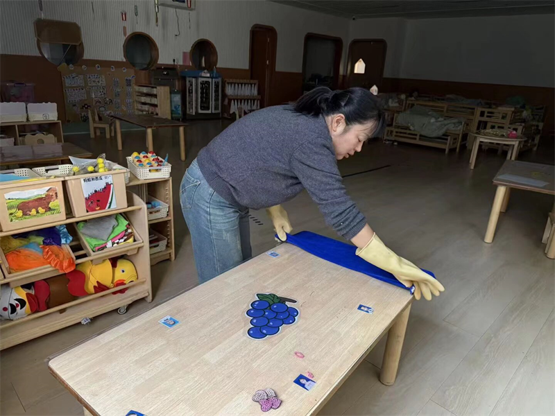 在专业消杀之外,全体保育员提前到岗开窗通风,落实日常精细化卫生打扫工作:对班级内幼儿桌椅板凳、水杯、毛巾进行清洗消毒,整理床铺、擦拭玩具柜、清扫地面,对班级卫生死角逐一清理,用细致入微的清洁,为幼儿打造干净整洁、空气清新的日常活动空间,减少春季病菌滞留。