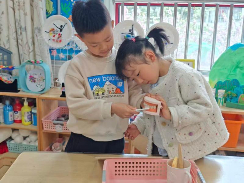中班聚焦口腔健康,教师借助牙齿模型,用通俗生动的语言讲解细菌对牙齿的危害,并示范正确的刷牙方法。幼儿边念儿歌边练习刷牙动作,在轻松愉快的氛围中掌握早晚刷牙、饭后漱口等护齿常识。通过直观教学与实操练习,孩子们不仅学会了技能,更增强了自主护齿的意识。