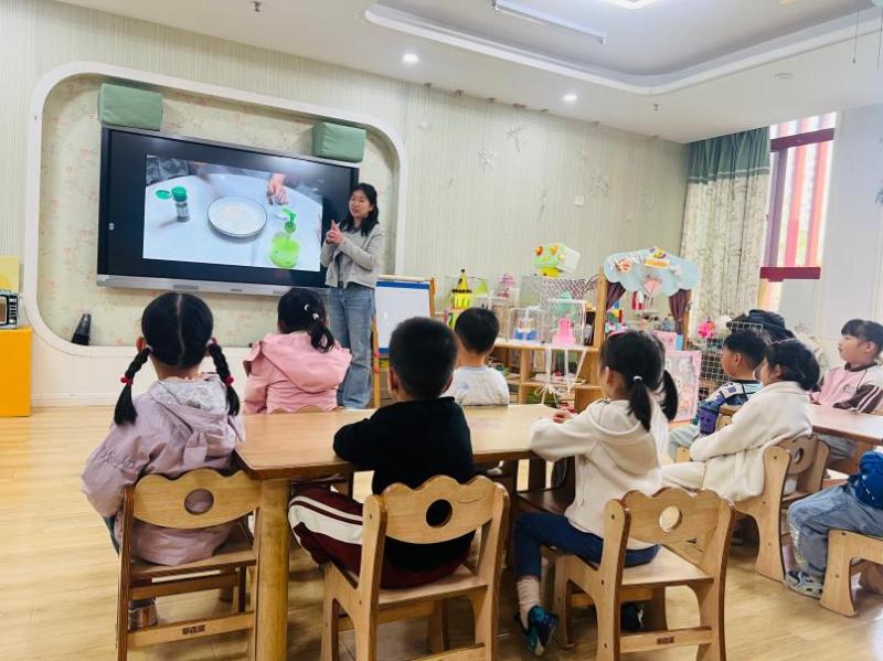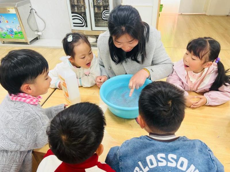小班则以趣味科学小实验点燃萌娃们的好奇心。教师用胡椒粉模拟灰尘和细菌,让幼儿亲眼看到漂浮的“细菌”,再通过蘸取洗手液触碰水面,见证胡椒粉迅速散开的奇妙过程。简单直观的实验让孩子们恍然大悟:洗手真的能把“细菌”赶跑!随后,教师带领幼儿复习七步洗手法,将讲卫生、勤洗手的生活理念根植于幼小心灵。