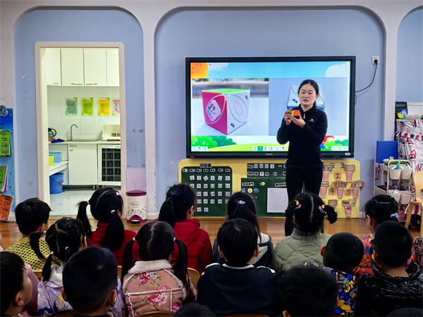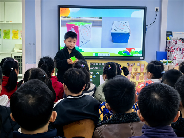 活动初期,老师通过视频、图片等生动有趣的方式向孩子们介绍六色枫叶魔方的基本构造和玩法,孩子们好奇又专注,目不转睛地看着老师手中不断变换的魔方,眼中满是对探索魔方世界的渴望。在随后的学习环节,孩子们围坐在一起一边探索一边交流复原魔方的方法,尽管困难重重,但没有一个孩子轻言放弃。