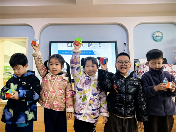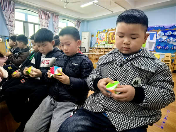 经过一段时间的练习,激动人心的魔方大比拼正式开始。小选手们个个信心十足,小手飞速转动魔方,彩色的方块在他们指尖快速变换。围观的小朋友们也热情高涨,为小伙伴加油助威,现场加油声、惊叹声此起彼伏。