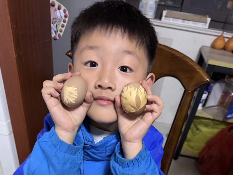 中班组开展“植物染蛋”亲子实践活动,孩子们在校园里寻找花草、芹菜叶等自然材料带回家,家长配合准备鸡蛋、纱布、皮筋、染料等物品。亲子一起将花叶贴在蛋面,用纱布包裹固定,再进行染色、静置、拆纱,制作出寓意健康平安的花草蛋。在动手创作与协作体验中,不仅增进了亲子感情,也让孩子们感受传统工艺之美,传承传统节日文化。