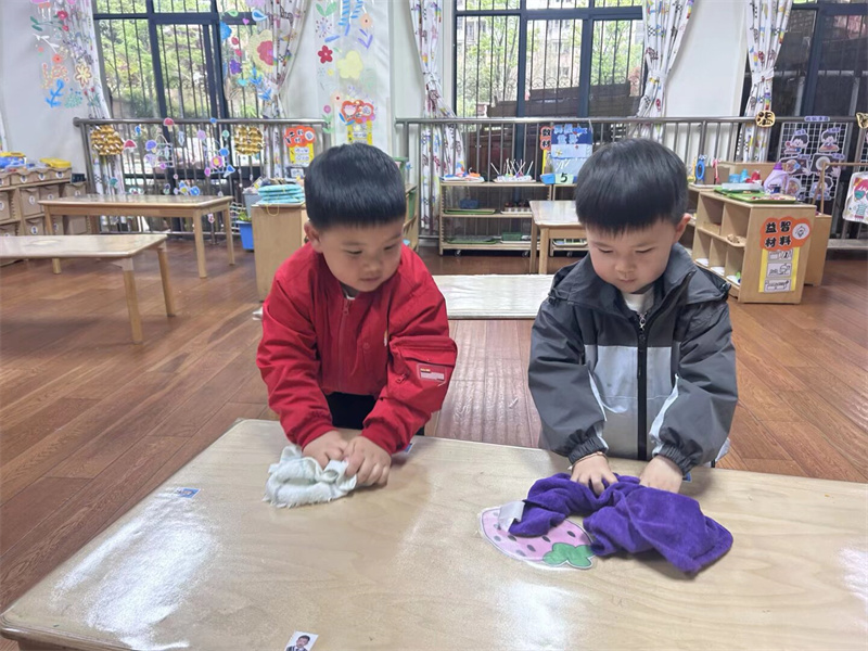 在实践体验环节,孩子们化身“小小清洁员”,积极参与清洁行动。大家拿起小抹布、认真擦拭幼儿园玩具、班级桌椅、整理区域材料。小小身影干劲满满,用双手装点幼儿园环境,在亲身劳动中感受清洁的快乐,萌发爱护环境的责任感。