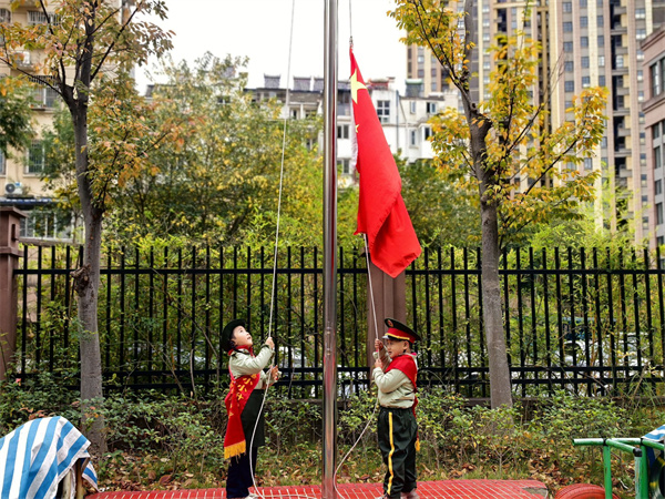 看,中二班的小升旗手们个个精神饱满、身姿挺拔,迈着整齐的步伐,托举着神圣的五星红旗向升旗台走去。升国旗,奏国歌,行注目礼,伴随着嘹亮的国歌,鲜艳的五星红旗冉冉升起,小朋友们的眼睛闪烁着光芒,专注地凝视着缓缓升起的五星红旗,此时此刻,心中流淌的是对祖国的热爱。