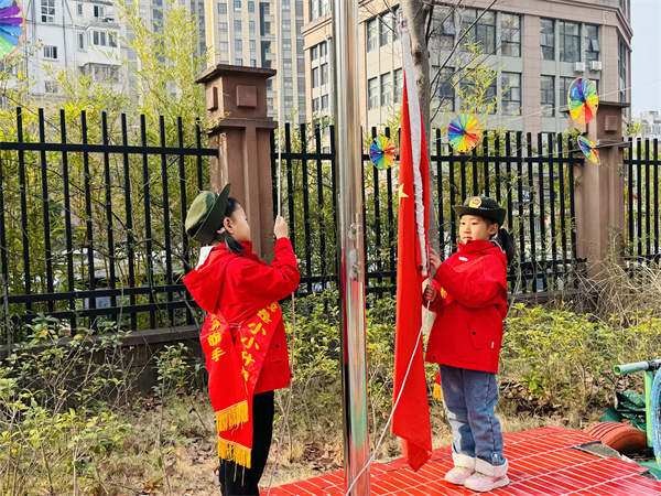 大二班的小小护旗手们,踏着整齐的步伐向我们走来,升国旗,奏国歌,鲜艳的五星红旗在空中冉冉升起,全体师生注视着五星红旗并高唱国歌。