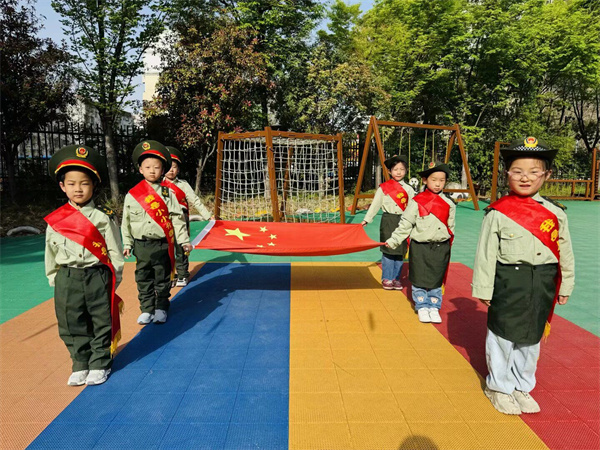 当日清晨,阳光洒在校园里,孩子们的笑脸如同春日花朵般灿烂。升旗仪式正式开始,担任小旗手的大二班小朋友们精神抖擞,迈着整齐的步伐护送国旗走向升旗台。在激昂的国歌声中,全体师幼庄严肃立,行注目礼,鲜艳的五星红旗冉冉升起,随风飘扬。