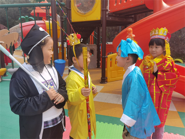 随着幼儿自主阅读《西游记》绘本的进行,他们对《西游记》也有了自己的初印象,并进行了第一次表征,用绘画的方式记录了《三借芭蕉扇》《火烧盘丝洞》《偷吃人生果》等表达自己对故事内容的理解和感受。瞧,他们还在《西游剧院》里有声有色地表演《三借芭蕉扇》的故事情节,赢得了小观众们的阵阵掌声。