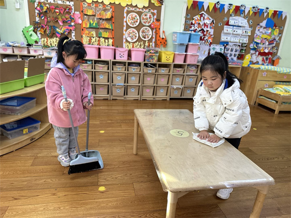 小小值日生开始啦。瞧!一个个忙碌的身影,一会儿收拾玩具,一会儿摆放桌椅,午餐结束后还用抹布擦起桌面,用小扫帚将地面清扫干净等。“老师快看我把图书分类摆放好了。”“老师,我们两个把椅子摆放的整整齐齐。”……自豪而悦耳的话语时常在老师耳边响起。小小值日生活动不仅美化了班级环境,更让每个孩子融入班集体,化身班级小主人,为自己的班级贡献力量,在行动中发展合作能力、整理归类能力。
