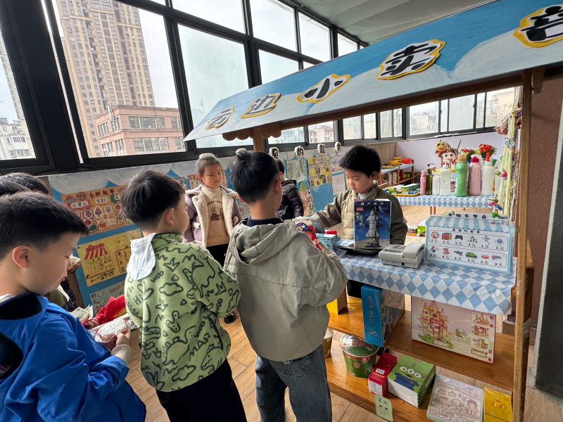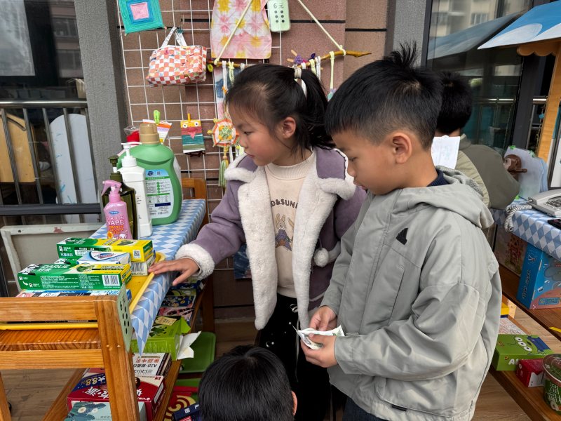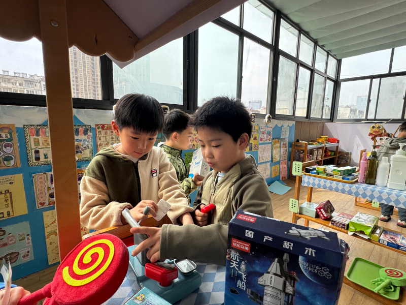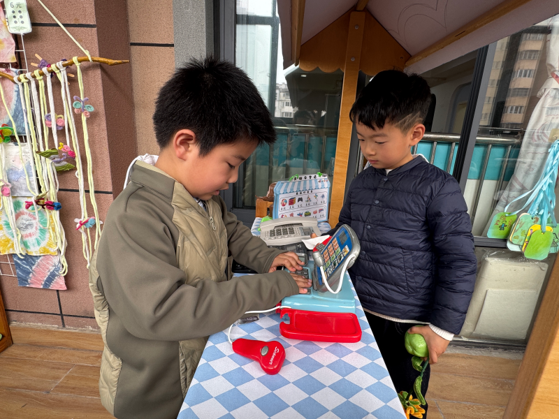 班级角色区“超市”与“编织店”同步开放。超市区域商品丰富,价格延伸至10元,搭配仿真钱币、收银台等道具;编织店陈列孩子们亲手制作的作品。幼儿自主选择角色,化身收银员、导购员与顾客,在真实购物场景中,运用10以内加法计算总价、完成付钱找零。