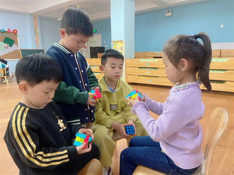 再回到教室后,小朋友们还是围着姐姐学习三明治魔方。