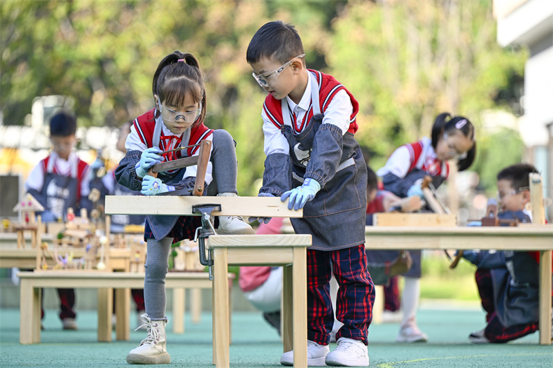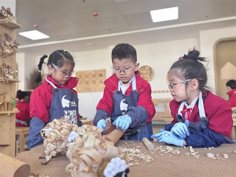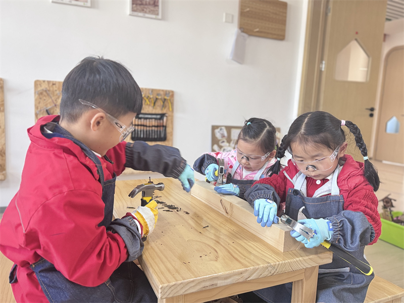 在绿意盎然的幼儿园一角,桌子上摆放着整齐的工具,小木匠们身着统一的防护服,戴上护目镜和手套,瞬间进入“工作模式”。在老师的专业指导下,孩子们手持刨子,认真练习刨花技艺,看着木屑如卷花般簌簌落下,脸上满是成就感;握着小锤子,对准钉子小心翼翼地敲击,“咚咚”声里是他们对力量与精度的探索;操起小锯子,专注地将木头进行切割,一下下锯木头的动作虽显稚嫩,却透着十足的认真劲儿。