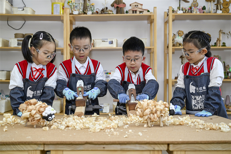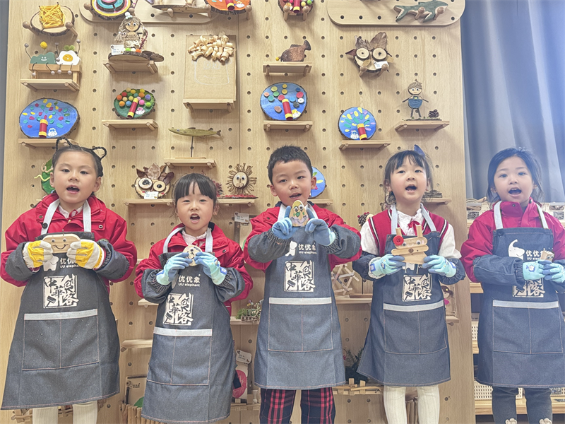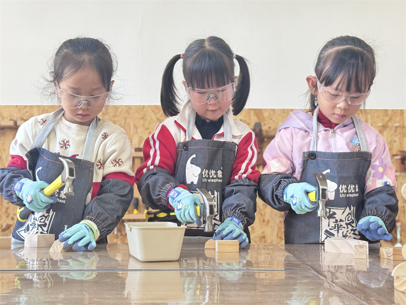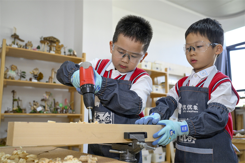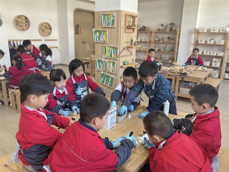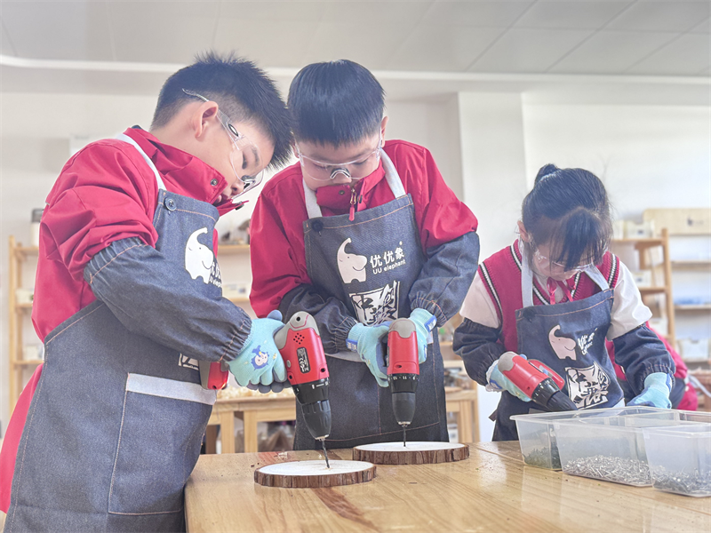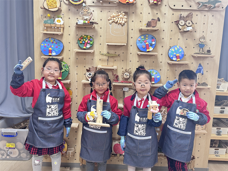 “我的小机器人就快完成啦!”木工室内,孩子们或专注地测量木材,或小心地使用工具切割、打磨,稚嫩的脸庞上满是认真与好奇。通过亲身体验木工操作技能,他们的动手实践能力得到了充分锻炼,在一凿一锯、一拼一粘中,不仅收获了亲手制作的 “木工成果”,更在潜移默化中培养了耐心、细心的工匠精神,体会到劳动创造的乐趣。