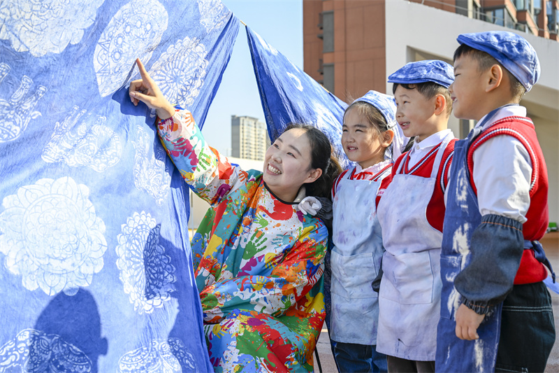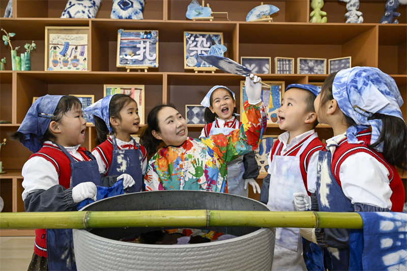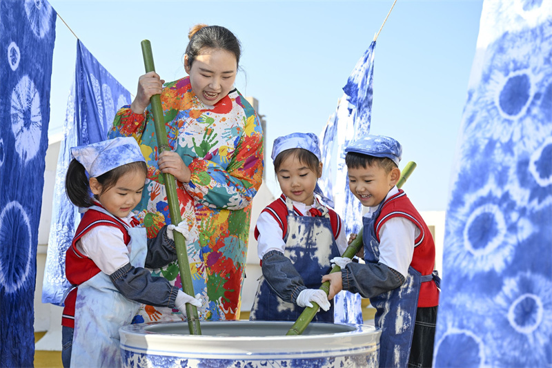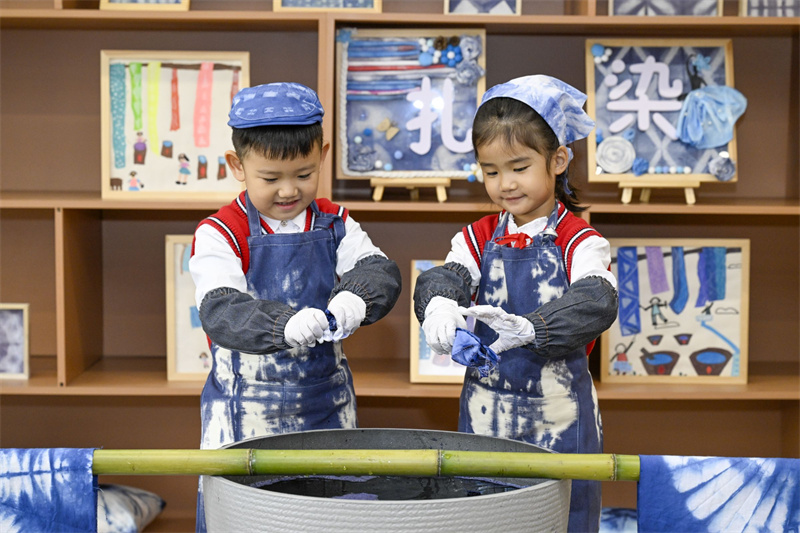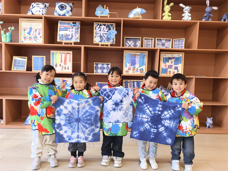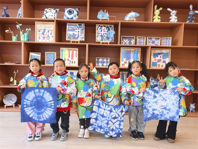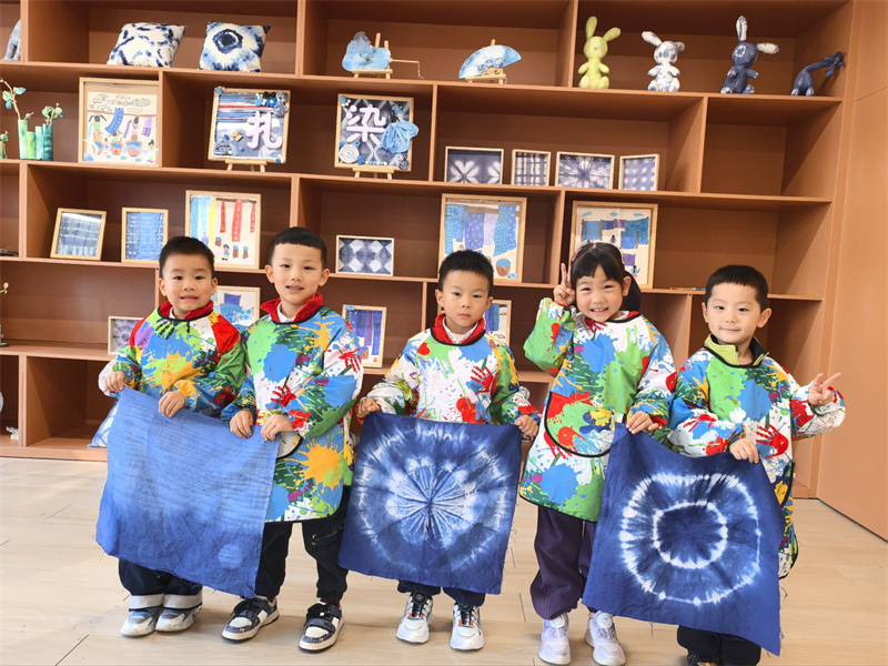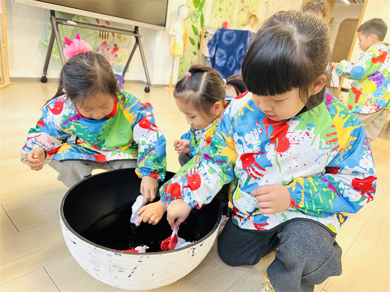 巧手扎锦绣,布里染斑斓。本次扎染活动的开展,不仅培养了幼儿对中国传统艺术的兴趣,也让这门凝练素雅、韵味别致的扎染艺术在幼儿园里得到了传承。
