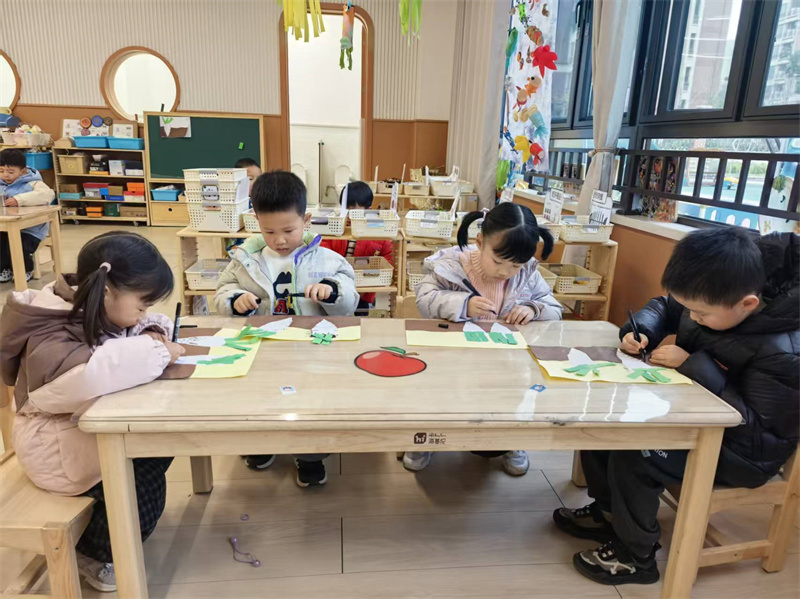 紧接着,孩子们化身“小小厨神”,在老师指导下安全切萝卜。他们握紧小刀,踮着脚尖认真将萝卜切成小丁,随后合力把萝卜丁整齐摆进竹匾晾晒,还小声讨论:“晒好的萝卜干会脆吗?”“我想分享给爸爸妈妈!”此外,萝卜还成为创作素材,孩子们用彩纸撕贴出满是绿叶和笑脸的萝卜贴画,作品满是童真。