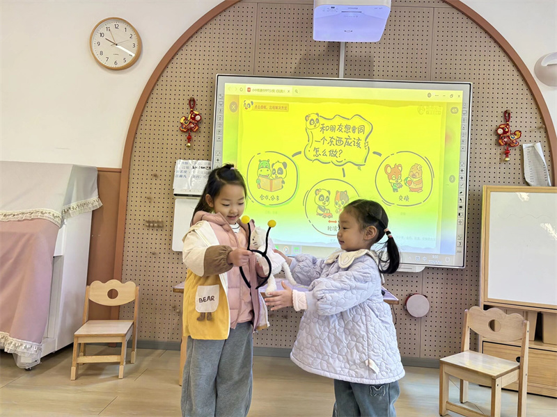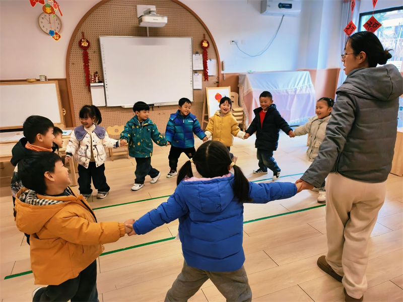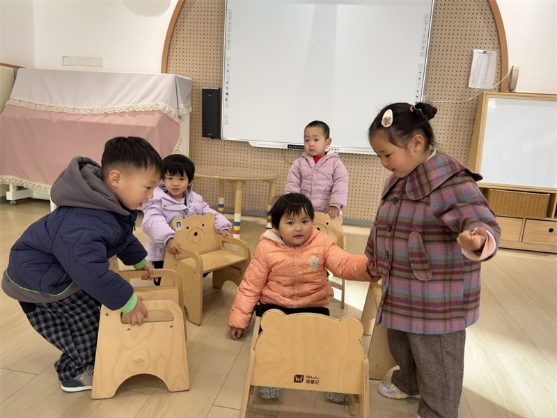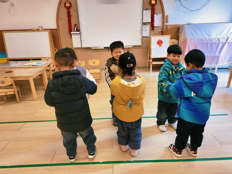 小四班的音乐游戏《找朋友》温情满满。随着欢快的旋律响起,孩子们主动寻找伙伴,手拉手唱歌跳舞,在互动中学会主动交往、友好合作,感受集体游戏的愉悦氛围。