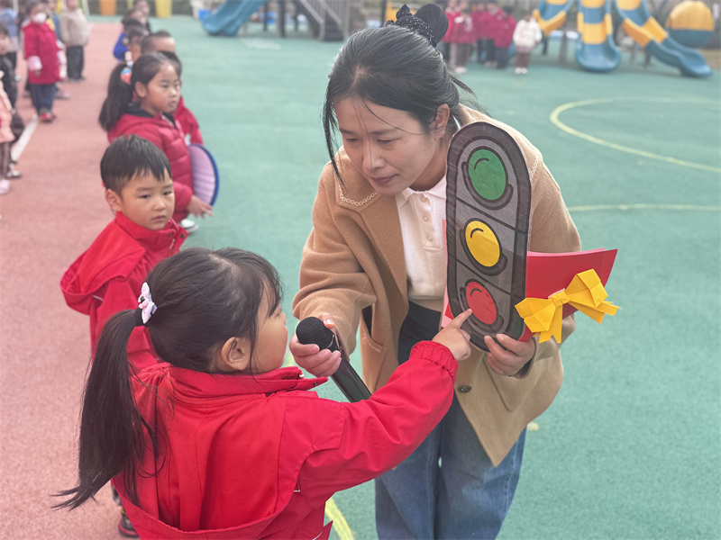 升旗仪式上,主持人老师和孩子们亲密互动,通过出示交通信号灯、交通安全标志,引导幼儿讨论如何看红绿灯、如何过马路等基本交通安全知识。孩子们积极举手、踊跃分享,在轻松的互动中深化了对交通安全的认知。最后,中二班的小朋友们还带来了精彩的节目,清脆悦耳的歌声、活泼可爱的动作,将童真与快乐传递给了每一个人。