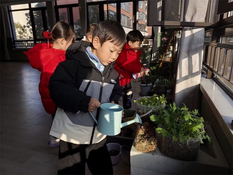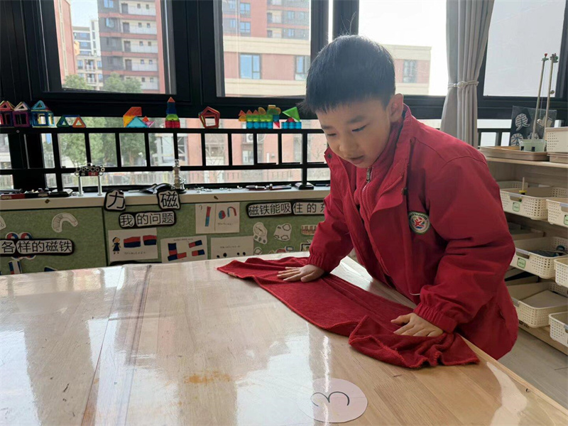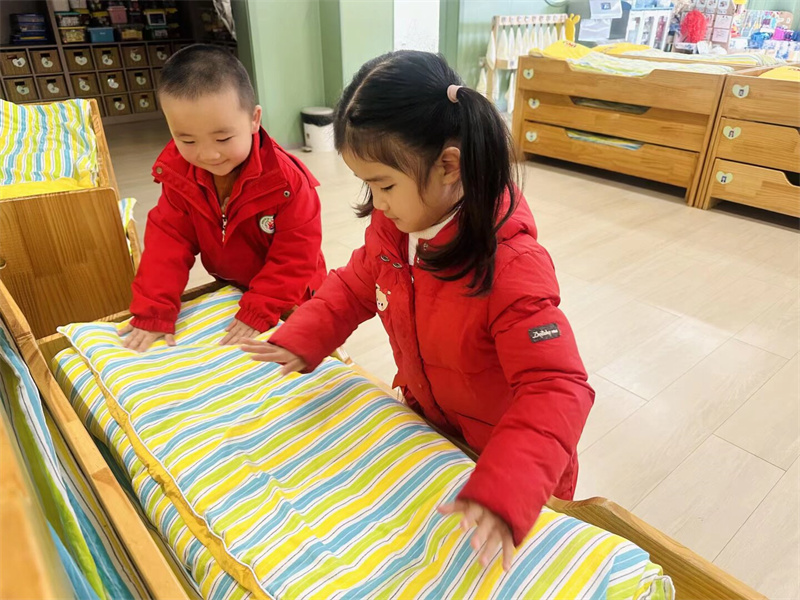 中一班的孩子们正在尝试“自己的事情自己做”,自己叠被子、整理收纳筐等有条不紊;中二班的孩子们浇植物、整理图书,在分工合作中体验为集体服务的乐趣;大班的哥哥姐姐们则以“值日生”身份,承担分发餐具、清理桌面等任务,在劳动中强化责任与担当。