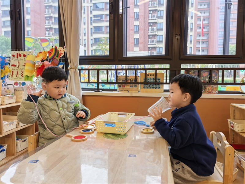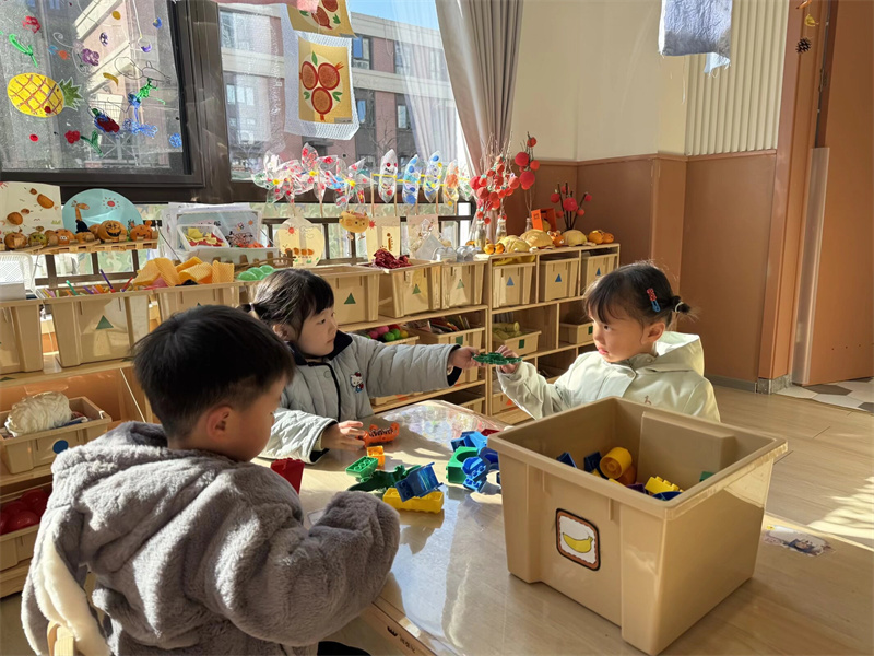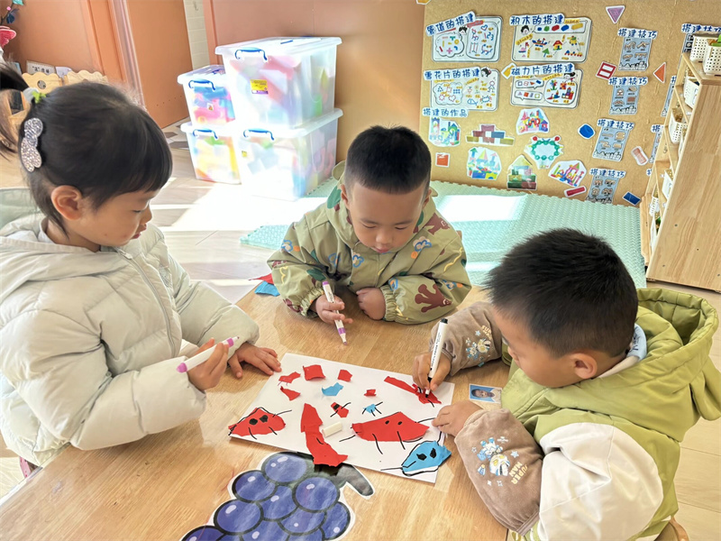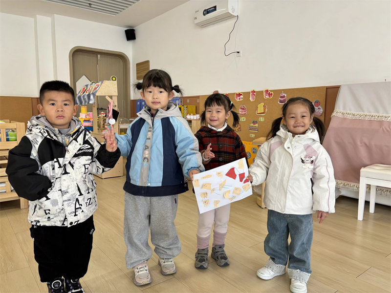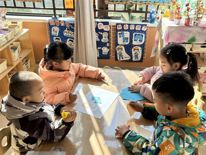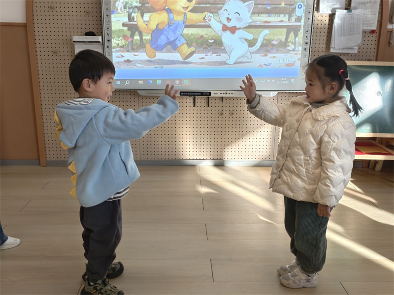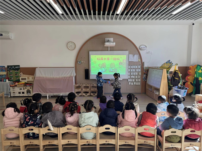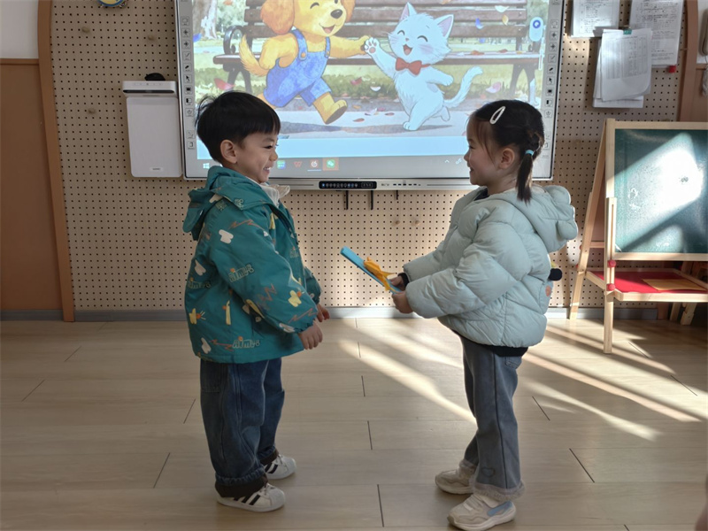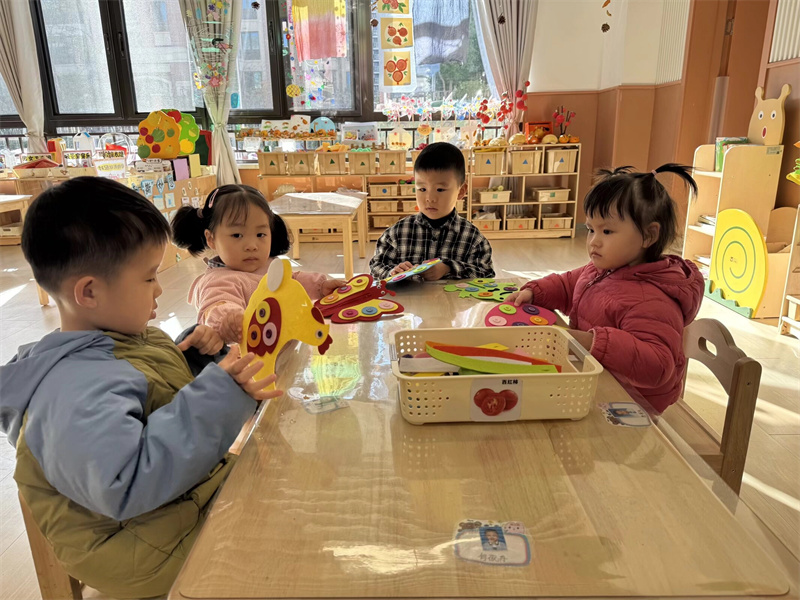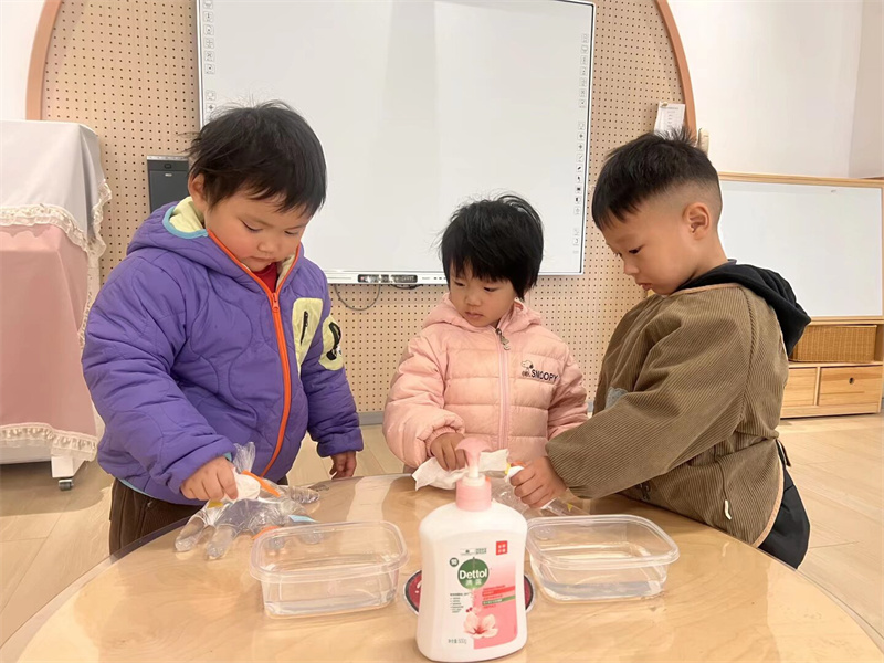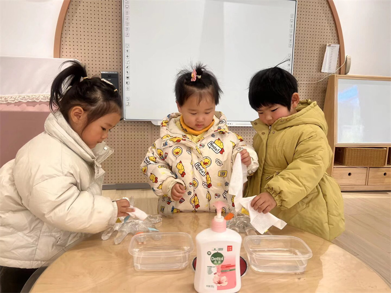 托班及小一班聚焦基础健康习惯养成,开展“小手洗出健康来”活动。教师将七步洗手法编成《洗手歌》,搭配趣味动作示范,引导幼儿边唱边练,帮助幼儿轻松掌握洗手技巧,树立讲卫生的意识;小二班开展“玩具分享会”,幼儿依次介绍玩具玩法并结对交换,在互动中体验分享乐趣,学会温和表达需求;小三班以“小组合作画”为载体,组织幼儿分组共同创作,培养合作能力;小四班开展“交友小达人”情景模拟活动,引导幼儿用礼貌用语表达意愿、主动关心他人,提升交友能力。