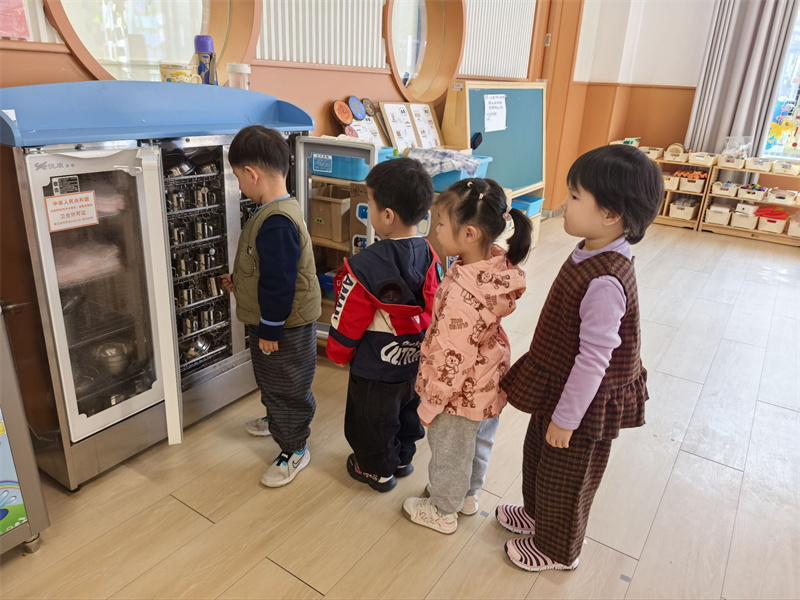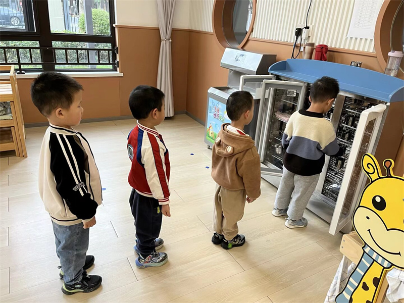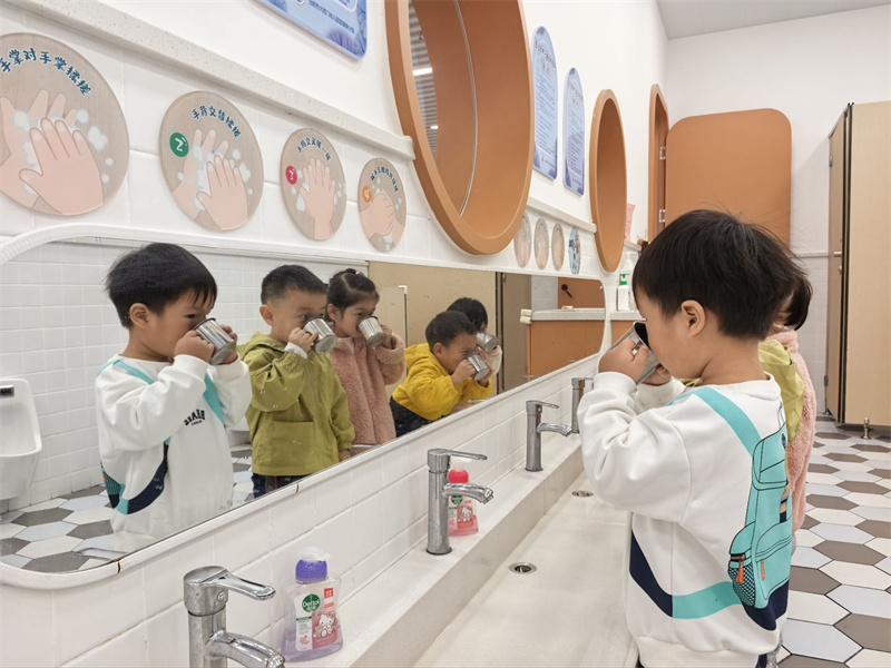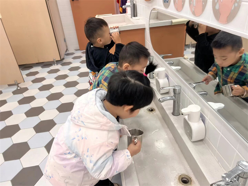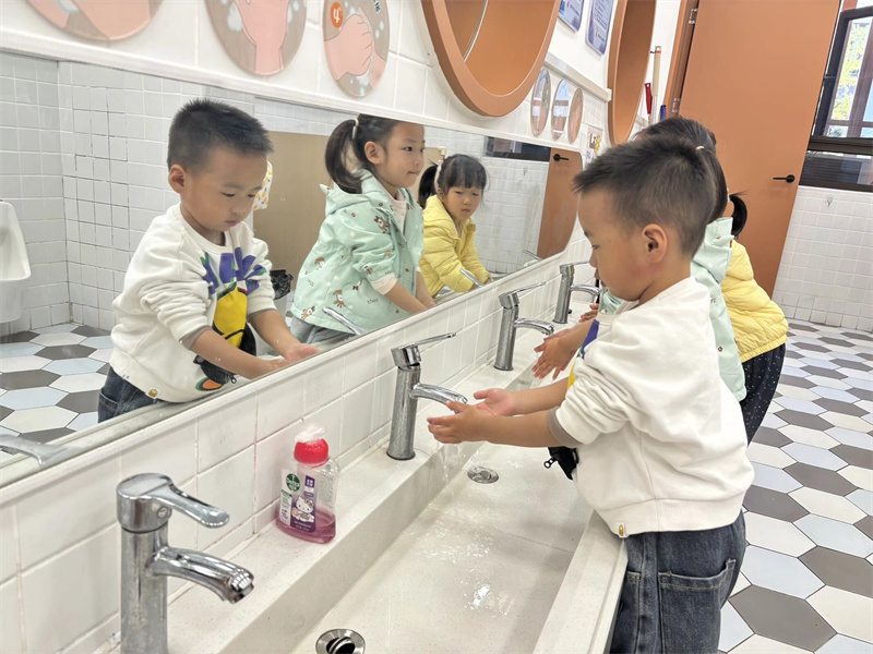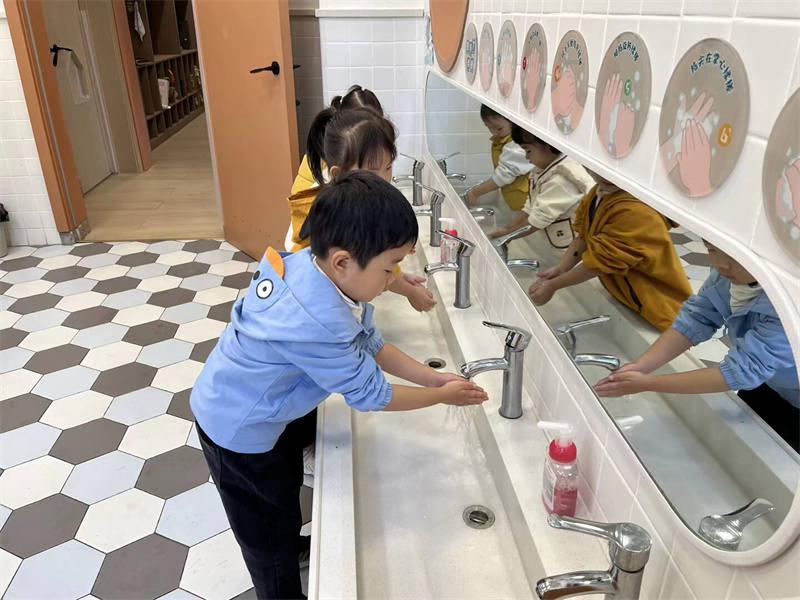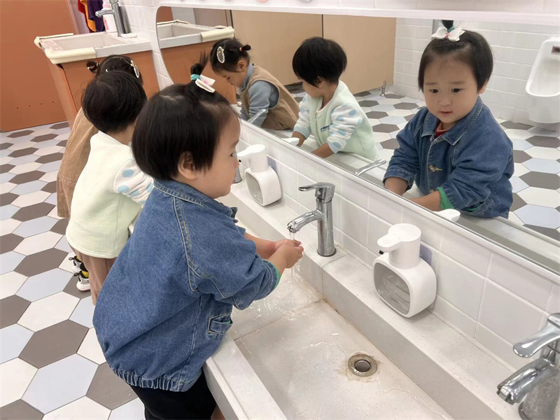 活动中,教师引导幼儿认识水杯的专属标记。孩子们拿着自己的水杯兴奋地说:“这是我的水杯!” 通过专属标识,幼儿快速认清个人物品,物品管理能力初步养成。伴随《洗手歌》的朗朗旋律,幼儿跟着口诀认真搓洗掌心、指缝。“我会自己把袖子卷起来洗手啦!” 孩子们边洗边自豪地分享,“勤洗手、讲卫生” 的好习惯悄悄扎根。通过 “伸伸手、钻钻洞” 的趣味口诀,教师指导幼儿穿脱套头衫、松紧裤。孩子们两两一组互相鼓劲,熟练完成穿脱外衣、拉拉链、穿鞋,精细动作与自理能力同步提升。餐后,孩子们有序拿起小毛巾擦嘴,再端起水杯漱口,教师在旁细致指导,帮助幼儿养成良好卫生习惯,为健康集体生活筑牢基础。