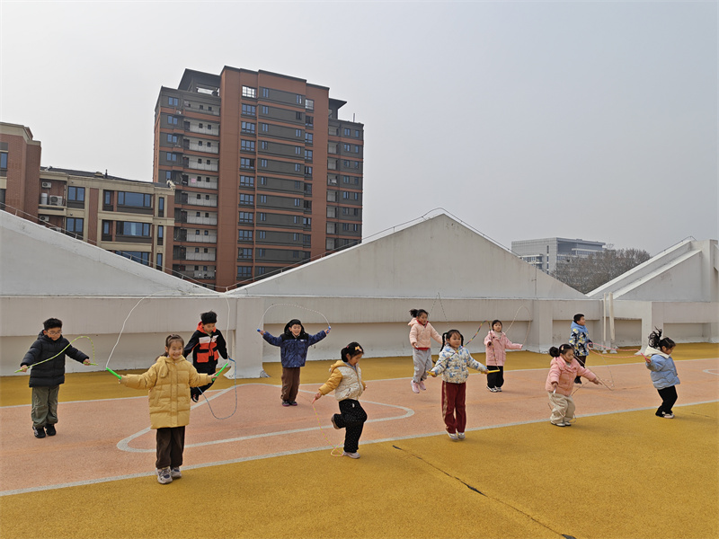 随后,多样化跳绳活动有序开展。单人跳绳时,孩子们个个精神抖擞,手腕灵活摇绳、双脚轻盈起跳;双人结伴跳中,两人默契配合、尽显同伴间的信任与协作;多人集体摇绳跳时,大家齐心协力把控节奏,跳绳在空中划出优美弧线,展现出扎实的运动技能与昂扬向上的精神风貌。