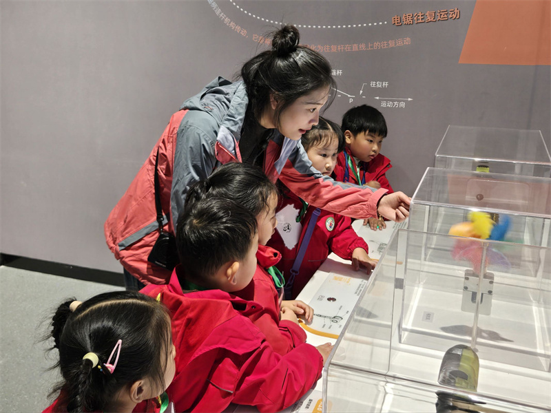 大班的孩子们像真正的“小小研究员”,满怀热情地穿梭于“能量厅”、“工具厅”与“连接厅”之间。他们不仅在能量厅里亲眼见证齿轮如何施展“魔法”,点亮灯泡、带动转轮;还在工具厅里亲手触摸古今工具,感慨于人类智慧的传承;更在连接厅里,着迷地看着交通与通信模型如何将世界紧密相连。一系列深入的探索,让抽象的科学原理化为了他们手中可触碰、可理解的奇妙游戏。