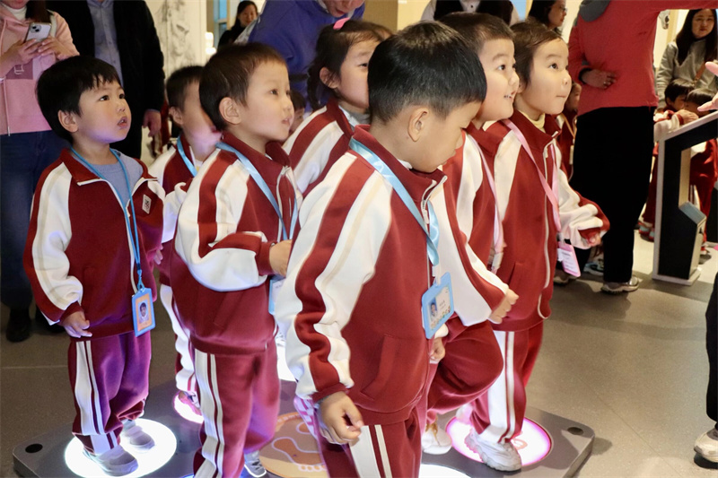 中班的宝贝们化身为“好奇小精灵”,他们的探索之旅同样丰富多彩。从“我们厅”的人体奥秘,到“安宁厅”的自然力量模拟,再到“度量厅”的平衡与测量游戏,他们在各个展厅中快乐地穿梭。一会儿在人体模型前惊讶地发现自己身体的“小零件”,一会儿又在海啸模拟台前紧张地攥紧栏杆,转眼间又为成功让天平保持平衡而欢呼雀跃。在亲身体验中,科学的种子悄然萌芽。
