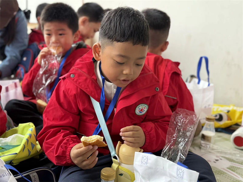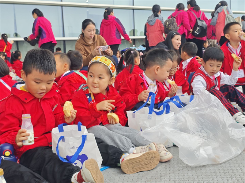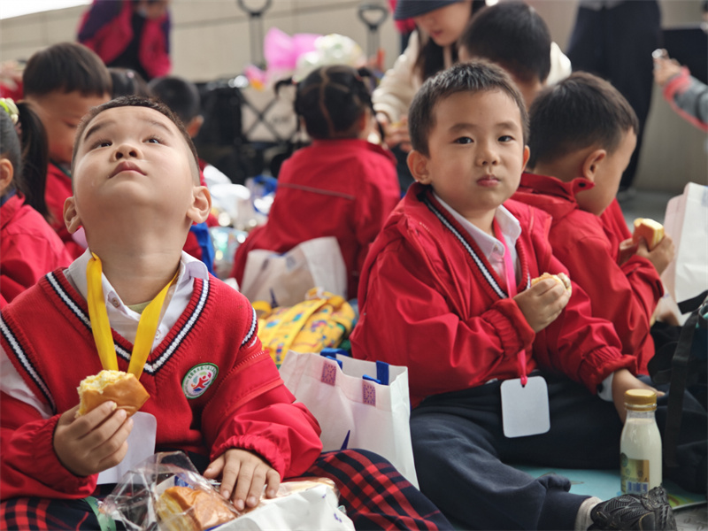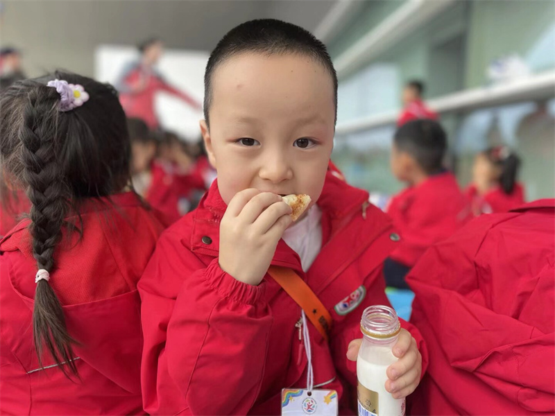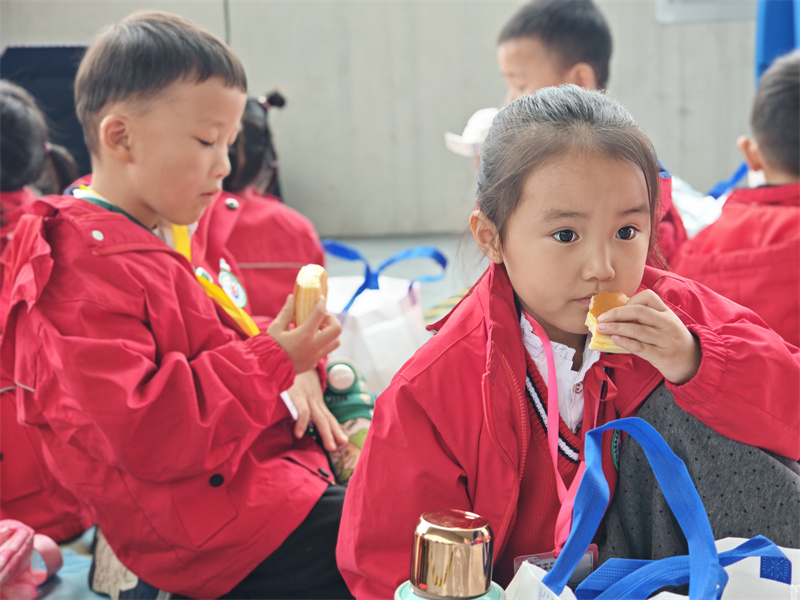 临近中午,老师带着孩子们在科技馆的休息区铺开彩色餐垫,开启了热闹的就餐环节:餐袋刚打开,香味就裹着雨气飘开——小蛋糕的甜香、水果的清爽混在一起,孩子们举着面包互相传递:“我的面包里面有火腿!”“这个橘子好甜!”吃到一半,有小朋友突然举着面包问:“面包里的小孔是不是科学变的魔术呀?”惹得周围人都笑起来,连老师都跟着接话:“这是酵母的‘科学魔法’哦!”雨还轻轻敲着窗户,餐垫上的笑声却比雨声更热闹,把科学的快乐也裹进了舌尖的甜香里。