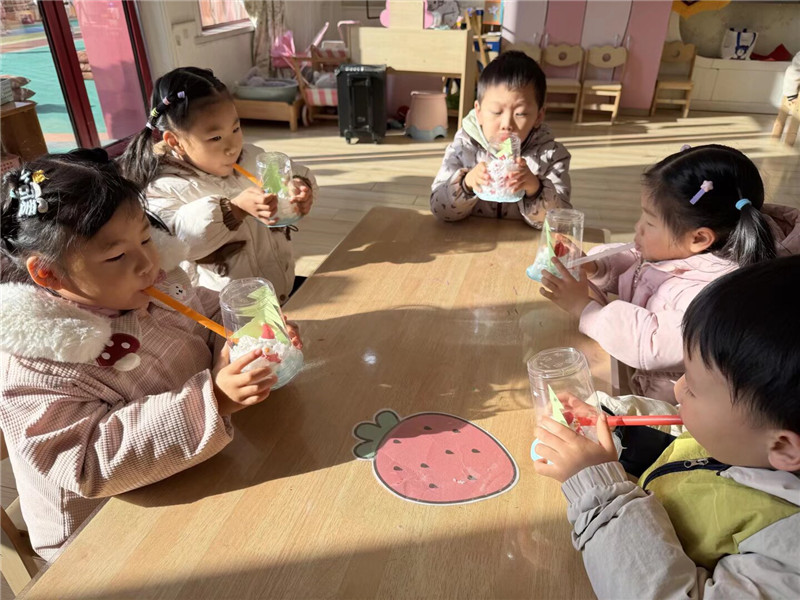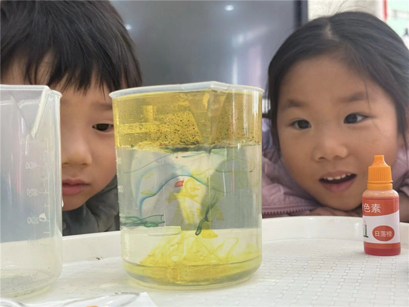 中班的活动室里,则上演着一场神奇的“魔法雪花”科学实验秀。老师为孩子们准备了清水、食用色素和吸水树脂,孩子们小心翼翼地将色素滴入水中,静静观察颜色在水中缓缓扩散的奇妙过程,再将吸水树脂轻轻撒入水中,看着它慢慢膨胀,变成一朵朵色彩斑斓的“魔法雪花”。在亲手操作的过程中,孩子们直观感受到了科学的神奇魅力,好奇心与探索欲也被充分激发。