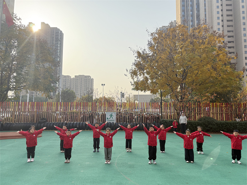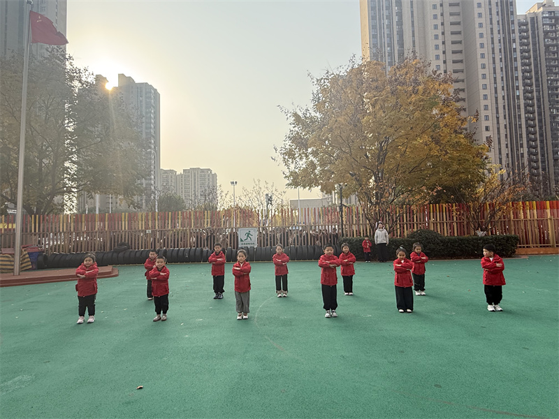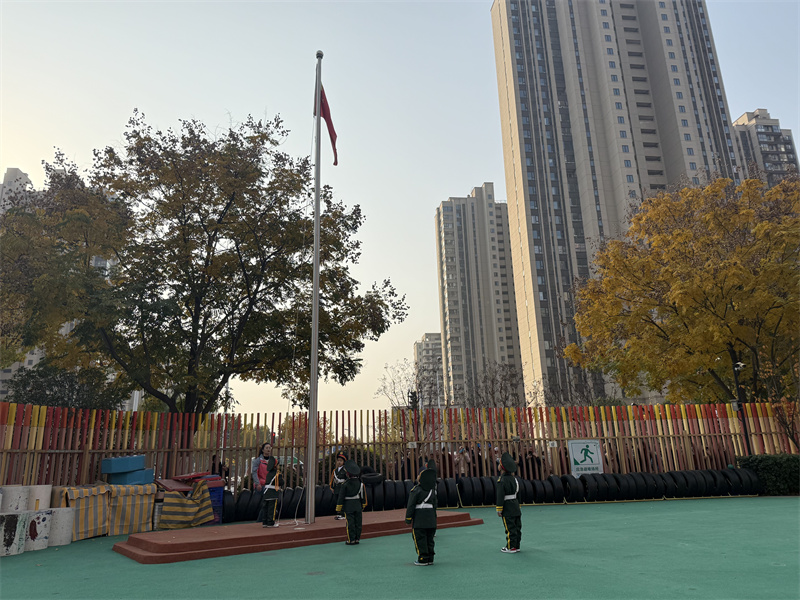 伴随着出旗音乐的响起,中四班的小旗手们昂首挺胸,护送五星红旗冉冉升起。行注目礼的小小身影里满是庄重,稚嫩的童声齐唱《国旗国旗多美丽》。