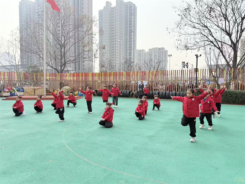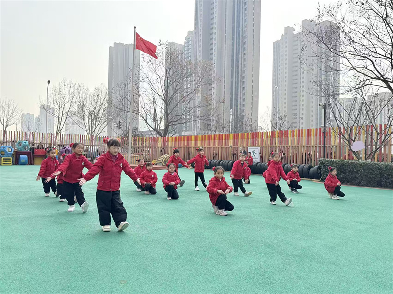 大四班的升旗手们在全体师幼的注目下,精神抖擞、步伐坚定地护送国旗入场。当雄壮的国歌奏响,五星红旗冉冉升起,全体师幼肃立注目,爱国之情在每个人心中激荡。升旗手们自信地进行自我介绍,展现了大四班哥哥姐姐的风采。随后,大六班的小朋友带来了精彩的节目表演《福气要来到》,欢快的节奏、活泼的动作,为本次活动增添了欢乐的氛围。