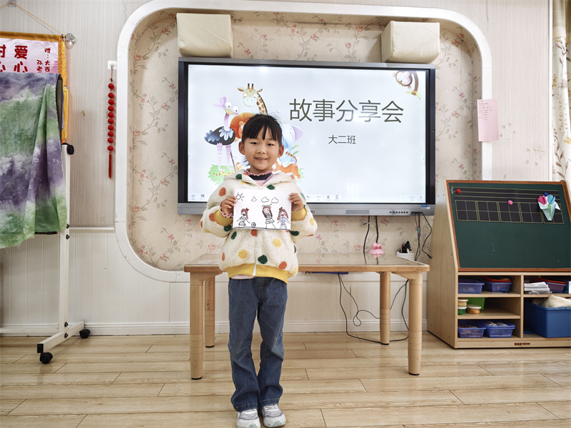 大一大二班创设“故事魔法屋”,大一班幼儿化身“故事小主播”,用生动的语言讲述绘本故事;大二班幼儿将《春日趣事》绘成连环画,安安小朋友指着画作描述画面内容:“我和溪溪在开满花的公园里跳舞!”活动有效提升了幼儿的语言表达与倾听理解能力。