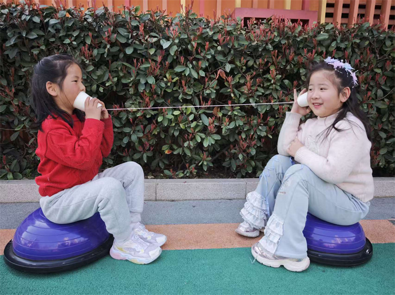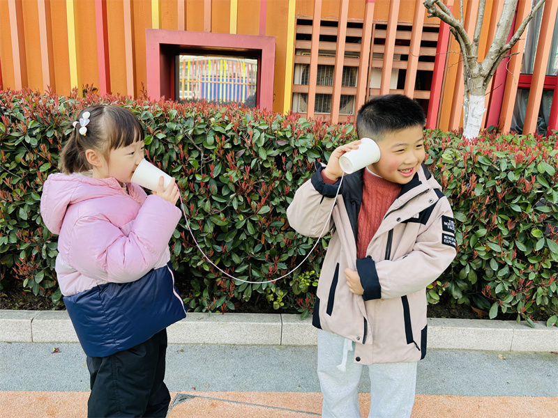 大五大六班的“声波快递公司”充满创意,幼儿通过自制传声筒接收指令:“请把蛋糕送到彩虹桥第二个桥墩!”小接线员们需准确复述地址并搭建路线。在纸杯传声筒实验中,幼儿发现声波传递的秘密,信息捕捉与任务执行能力显著提升。