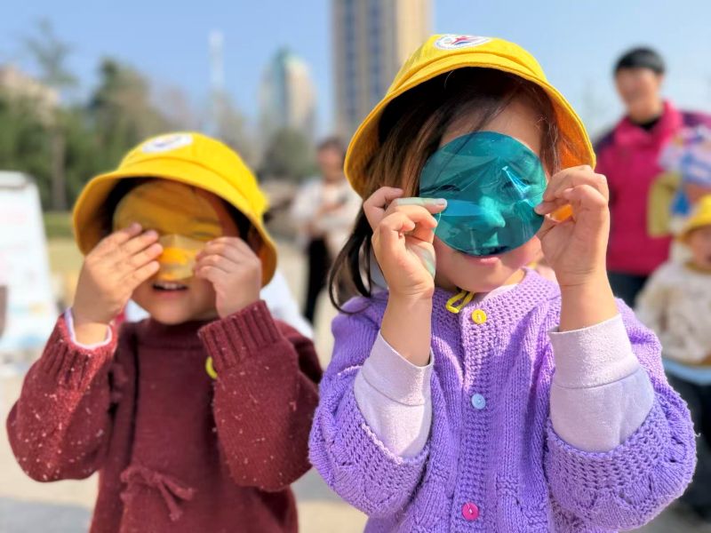 瞧,孩子们拿起彩色半透明纸片贴在眼前,透过红、黄、蓝、粉等缤纷薄膜观察世界。原本翠绿的树叶、粉嫩的花朵、澄澈的蓝天,瞬间换上了别样的绚丽“彩衣”。孩子们惊喜地欢呼雀跃,迫不及待和同伴分享自己眼中独一无二的春天,直观感受色彩叠加带来的神奇视觉变化。