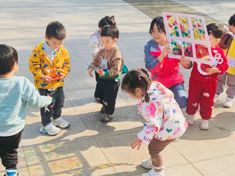 创意拼贴活动中,孩子们化身小小艺术家,认真地粘贴在小蜜蜂、小蝴蝶、小花造型的纸板上,悉心装扮着专属自己的作品。作品完成后,孩子们将手工制品置于阳光下,地面上立刻投射出五彩斑斓的灵动影子,可爱又别致。大家围着光影蹦蹦跳跳,尽情享受创意手工带来的满满快乐。