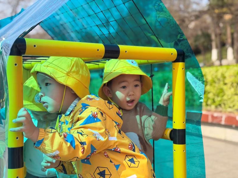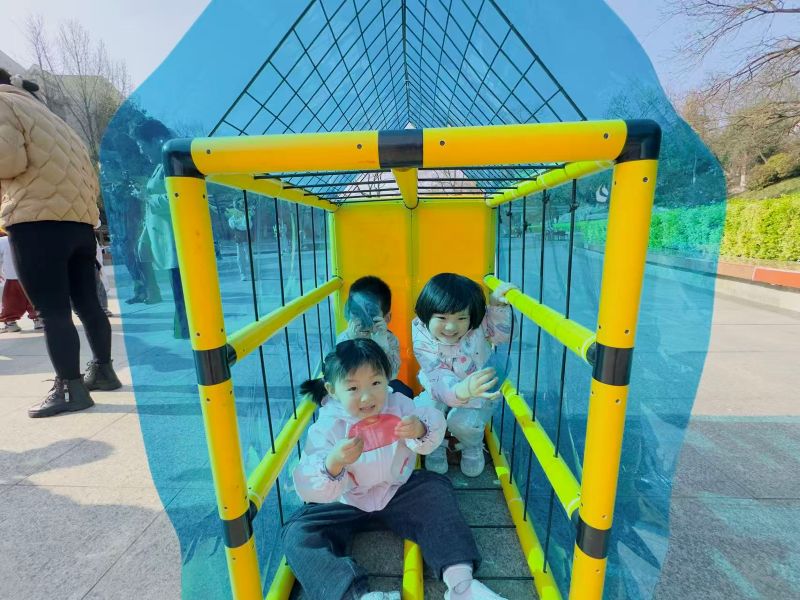 看,孩子们来到光影小屋旁,开启沉浸式光影体验啦!大家钻进温馨的小屋里,看着阳光透过薄膜,洒下斑驳绚丽的光影,感受着春日阳光的温暖与惬意,在小小的空间里嬉戏玩耍,体会大自然与创意结合的独特美好。