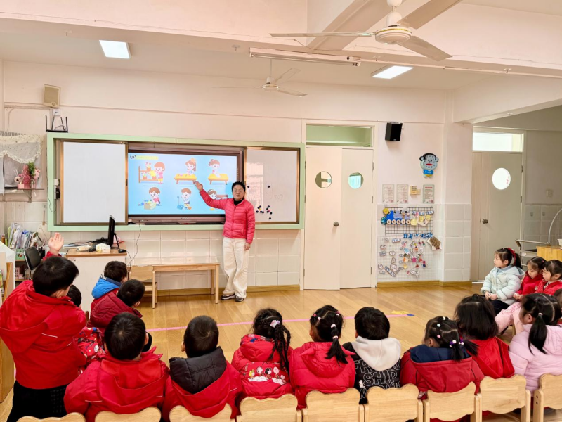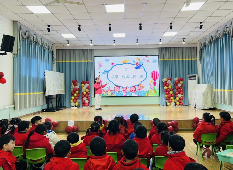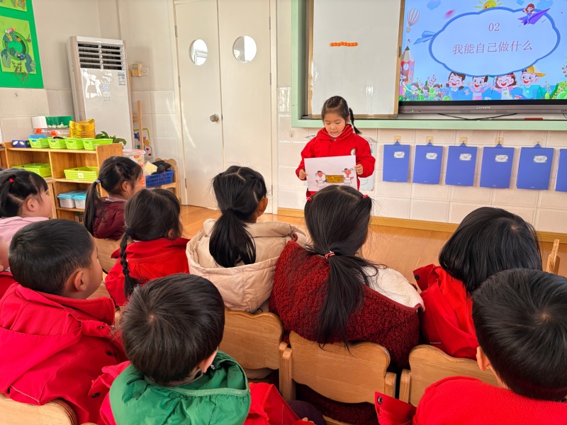 音乐厅内,教师通过生动讲述故事《自己的事情自己做》,带领孩子们走进情境。随后,围绕“我能自己做什么”展开热烈讨论。孩子们踊跃发言,从“自己穿衣服”“自己收玩具”到“自己吃饭”,在交流中逐渐明晰“自理”的含义,初步树立“我能行”的自信。