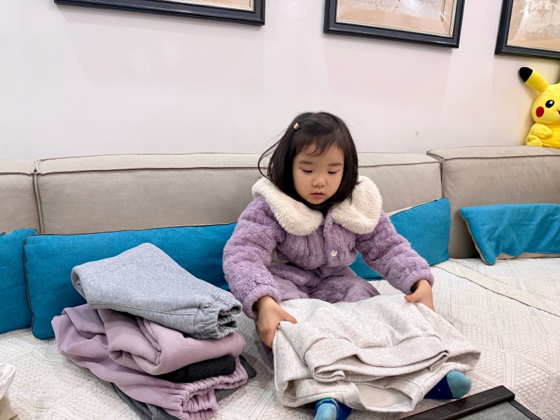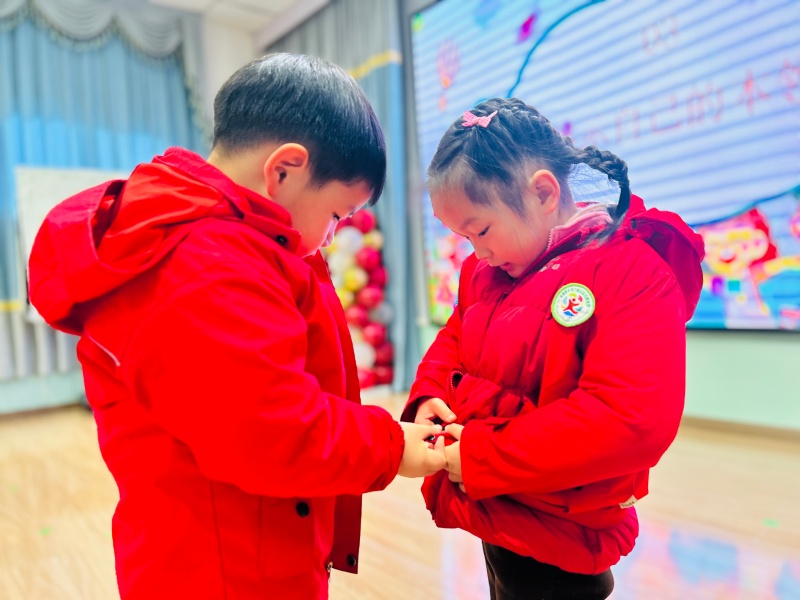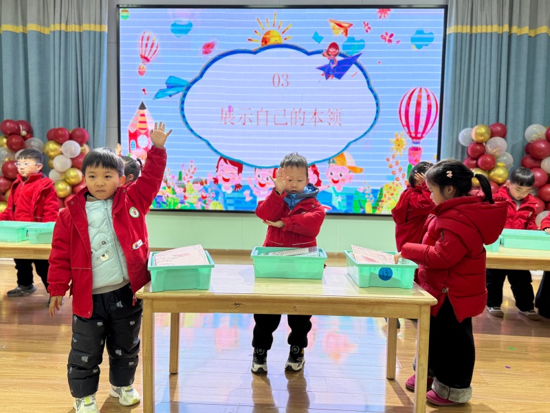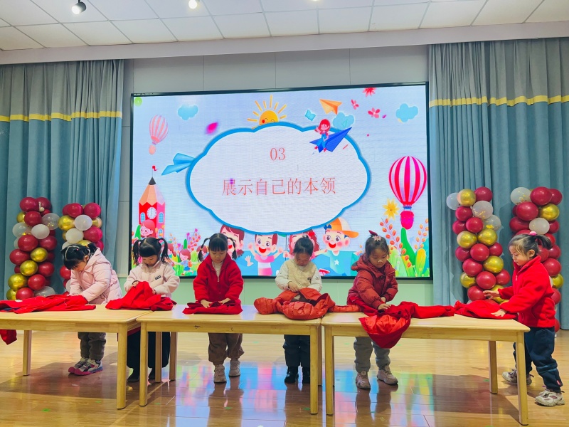 随着轻快的音乐响起,“自理能力大比拼”正式开始。孩子们分组进行穿外套、叠外套、整理学具筐等实操项目。有条不紊的动作、专注投入的神情,不仅锻炼了手眼协调与生活技能,更让孩子们在比赛中感受到劳动的乐趣与完成任务的成就感。