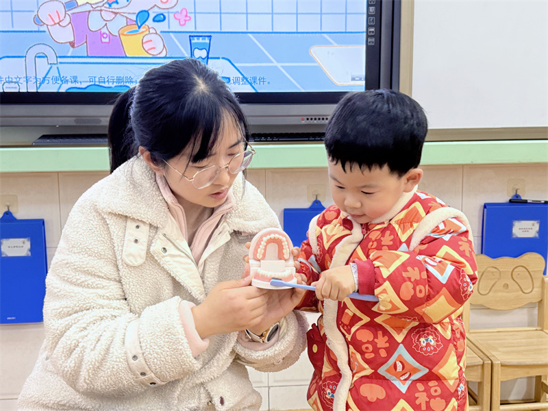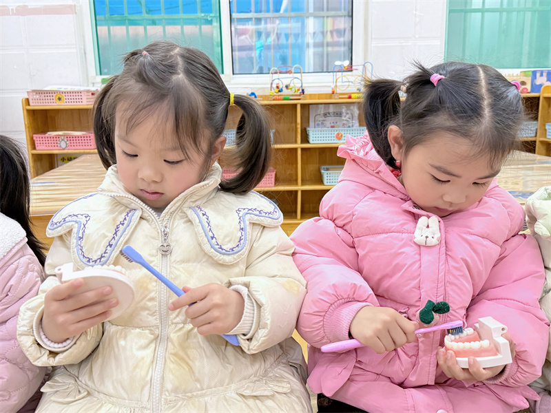 走进小托班组,一场充满童趣的“爱牙护牙”之旅正在展开。托班幼儿在“娃娃家”中为玩具宝宝“刷牙”,体验护牙乐趣;小班幼儿借助牙齿模型学习正确刷牙方法,在“赶走蛀牙虫”游戏中掌握刷牙技巧。活动还延伸至家庭,班级群发起“早晚刷牙打卡”,家园共育助力习惯养成。