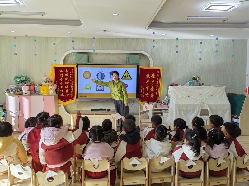 黄英、汪涣、李娜老师则通过“一课三研”的形式组织开展小班数学《形状宝宝》数学活动。通过PPT、触摸卡片等方式让幼儿感知圆、三角形、正方形的特征,以“找形状朋友”游戏巩固认知,引导幼儿寻找生活中的形状物品,帮助幼儿认识、区分形状并体验数学活动乐趣。