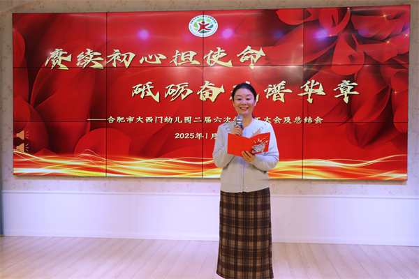 张园长指出:心向远方,不以风雨为阻;志在高峰,不以云雾为障。这一年是蓬勃发展的一年,所取得的每一点进步和成绩,都离不开全体教职工的辛勤付出和无私奉献。下一步,我园将继续逐步落实党建与保教、安全等各部门工作的融合,真正实现“五真党建,培根铸魂”党建品牌。主要通过实现党建+活动,提升保教质量;实现党建+队伍,培养充实后备力量。希望老师以此次大会为新的起点,满怀信心,蓄势待发,将庐阳民生工程中的幼儿教育“大写意”,以匠心独运的笔触,细腻描绘成与时代同频共振的幼教知名品牌“工笔画”。以稳健的步伐,昂首阔步于高质量发展的新时代征程上,用智慧与汗水,奋力书写着一幅幅绚丽多彩、熠熠生辉的教育新篇章。