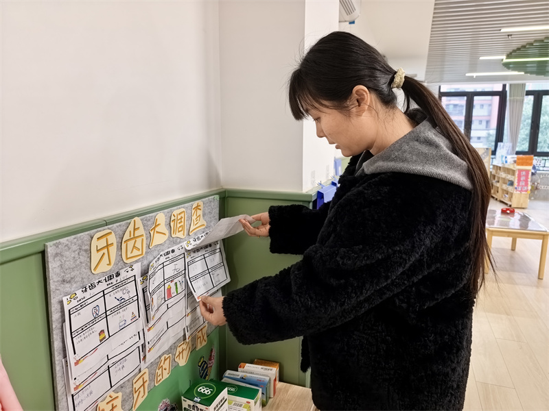 排查过程中,教师们化身 “文字侦探”,逐一巡查园内各个区域。在家园栏前,大家仔细核对通知公告、育儿知识、幼儿作品展示中的每一个文字,不放过任何一处细节,确保家园沟通的文字信息准确无误;在图书室,教师们分组对绘本、故事书、科普读物等各类书籍进行抽检,重点查看封面、扉页、内文的文字印刷错误及不规范用字,保障幼儿阅读资源的规范性;在各班教室,教师们逐一翻阅班级图书角的绘本、幼儿读物,同步检查幼儿作品中的文字标注是否准确;在走廊宣传栏、楼梯间标语、功能室标识等公共区域,教师们沿线路逐一巡查,对发现的不规范用字、错字别字及时记录、标记。