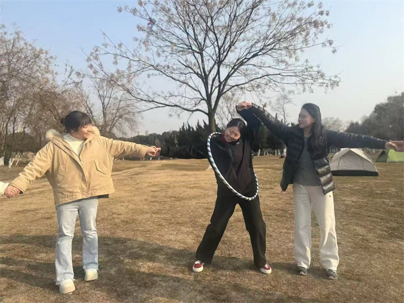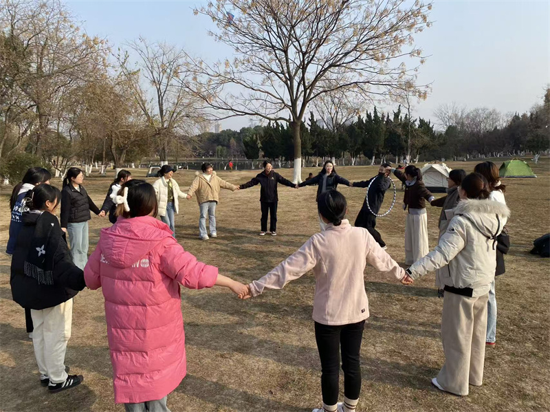活动伊始,老师们齐聚指定区域开展热身活动。在轻松愉快的氛围中,大家充分活动关节,为后续爬山做好准备。随后,趣味十足的“手拉手送圈”游戏拉开了活动序幕。老师们手拉手围成圆圈,齐心协力将呼啦圈依次传递,过程中欢声笑语不断,不仅增进了彼此间的默契与协作,更让现场氛围迅速升温。