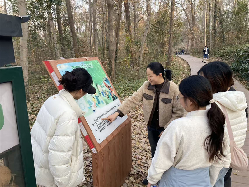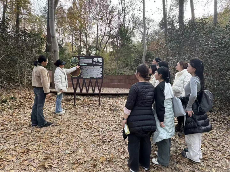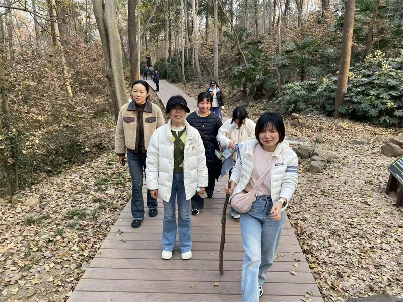 热身与游戏结束后,爬山活动正式开始。老师们沿着兼具环山路与楼梯的路线有序前行,沿途风光秀丽,各类特色植物错落有致。遇到标注科普介绍的植物时,大家纷纷驻足观察,认真了解植物特性,并拿出手机拍摄记录,在爬山健身的同时,也收获了丰富的植物科普知识。途中,老师们相互鼓励、彼此帮扶,充分展现了教师团结互助、奋勇争先的良好精神风貌。